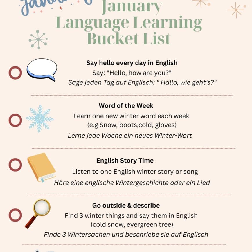How I Use a Monthly English Bucket List with My Family (and How You Can Too) Learning English doesn’t have to mean worksheets, forced lessons, or stress at the kitchen table. There is sometimes enough of that with other subjects! For my family — and for the families I work with through Outdoor Bilingual Learner…